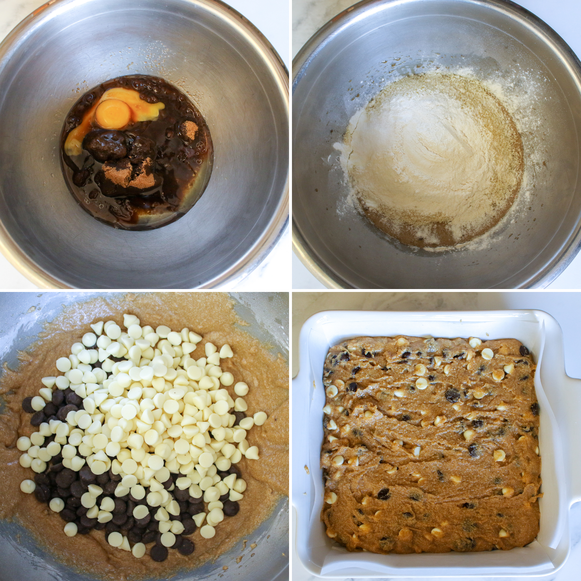 Once the chocolate chips are incorporated, pour the batter into a lined and greased 8×8-inch baking pan. Smooth the top of the batter with the spatula.