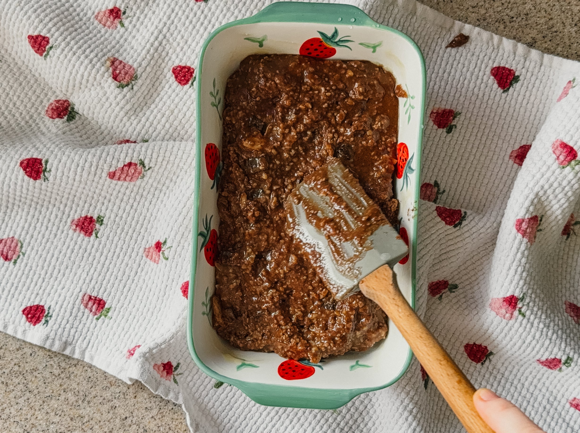 Prep a small baking dish with butter or cooking spray. Pour batter into the pan and spread evenly.