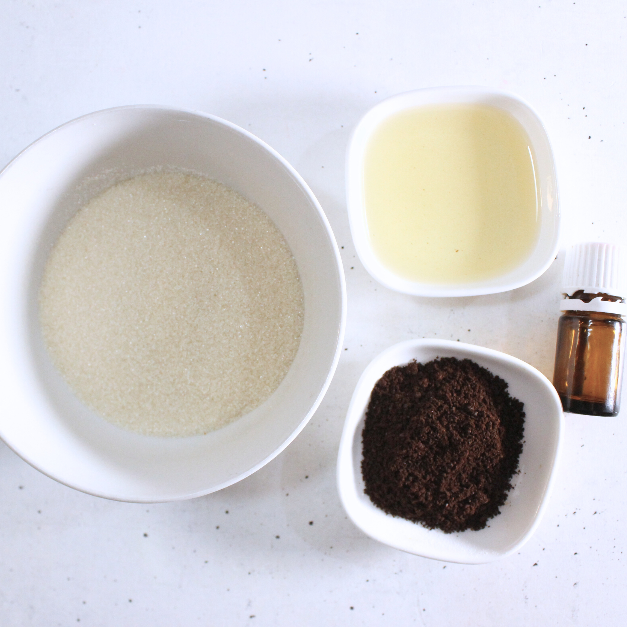 For this recipe you will need coffee-infused oil, finely ground coffee, sugar, vanilla oleoresin essential oil, and coffee essential oil.