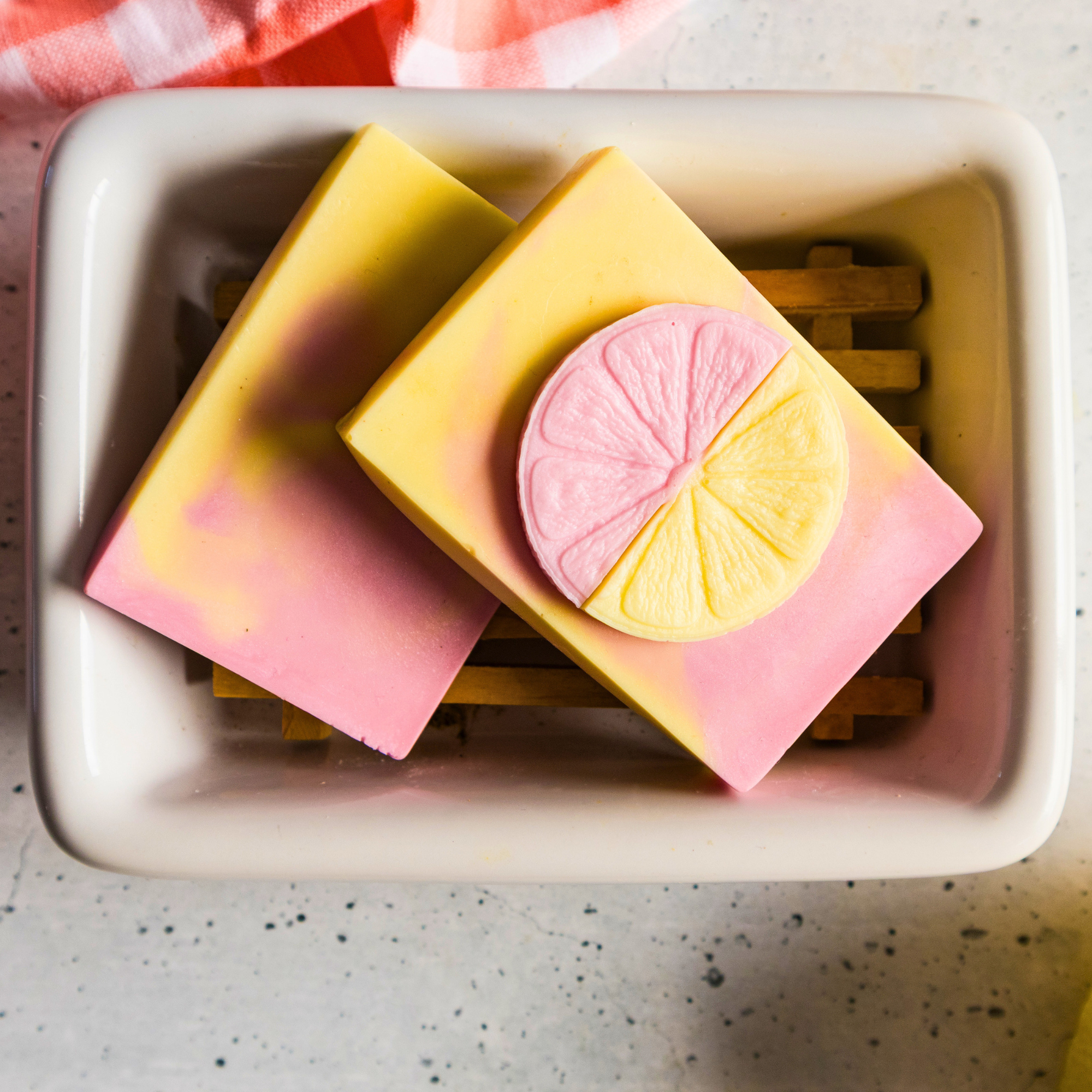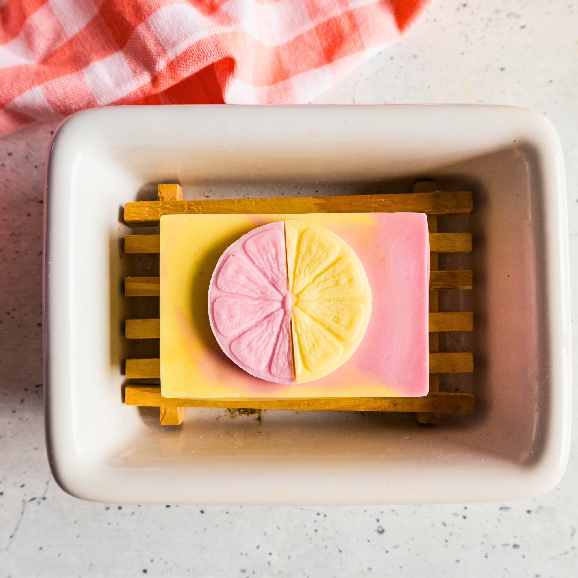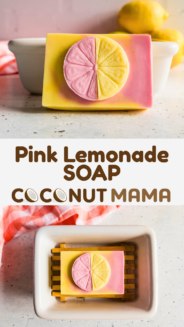 Learn how to make Pink Lemonade Soap with this easy melt and pour recipe. This DIY citrus soap features pink and yellow swirls, a fresh lemon and grapefruit scent, and adorable lemon embeds.
