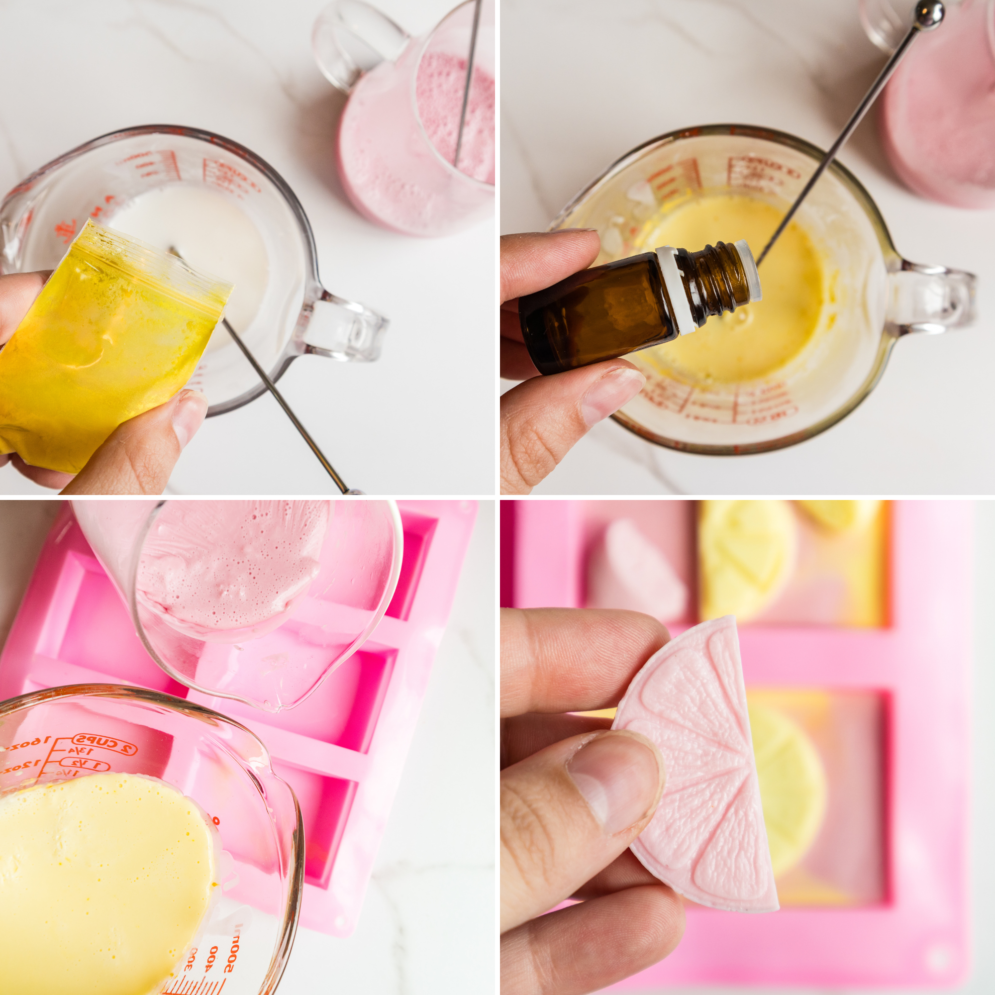 Pour any remaining soap into the small lemon molds and let all soaps harden.