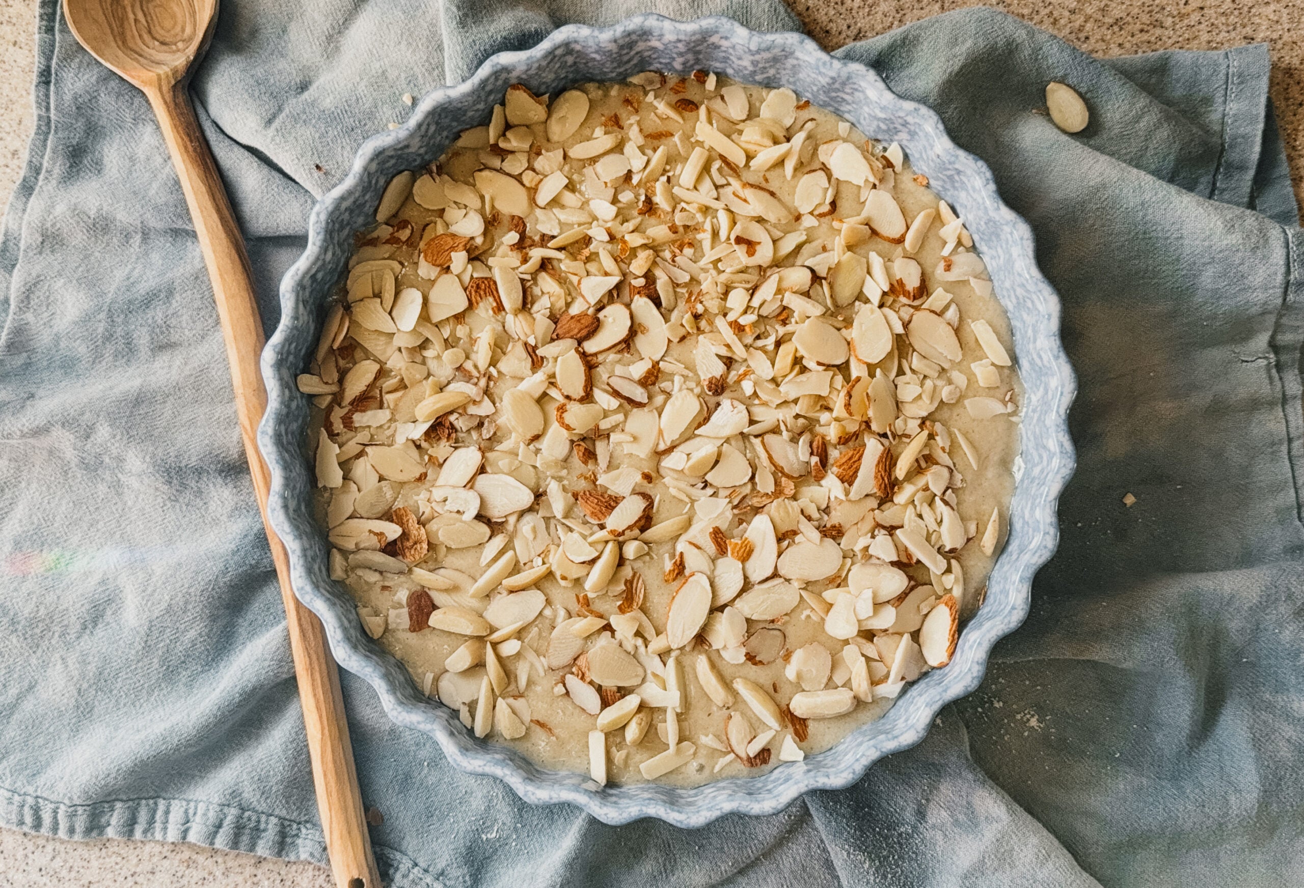 Step Five: Pour cake mix into the prepared pan and top with sliced almonds. Bake in oven for 35 minutes.