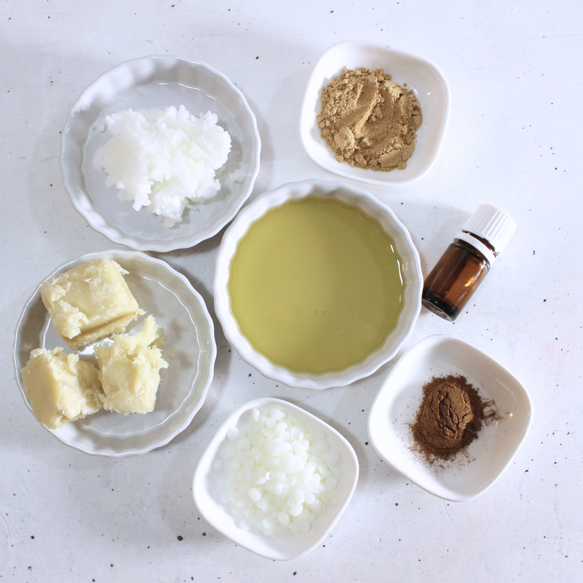 For this DIY you will need shea butter, coconut oil, almond oil, beeswax, ginger, cinnamon, vanilla essential oil, cinnamon essential oil,ginger, and clove essential oil.