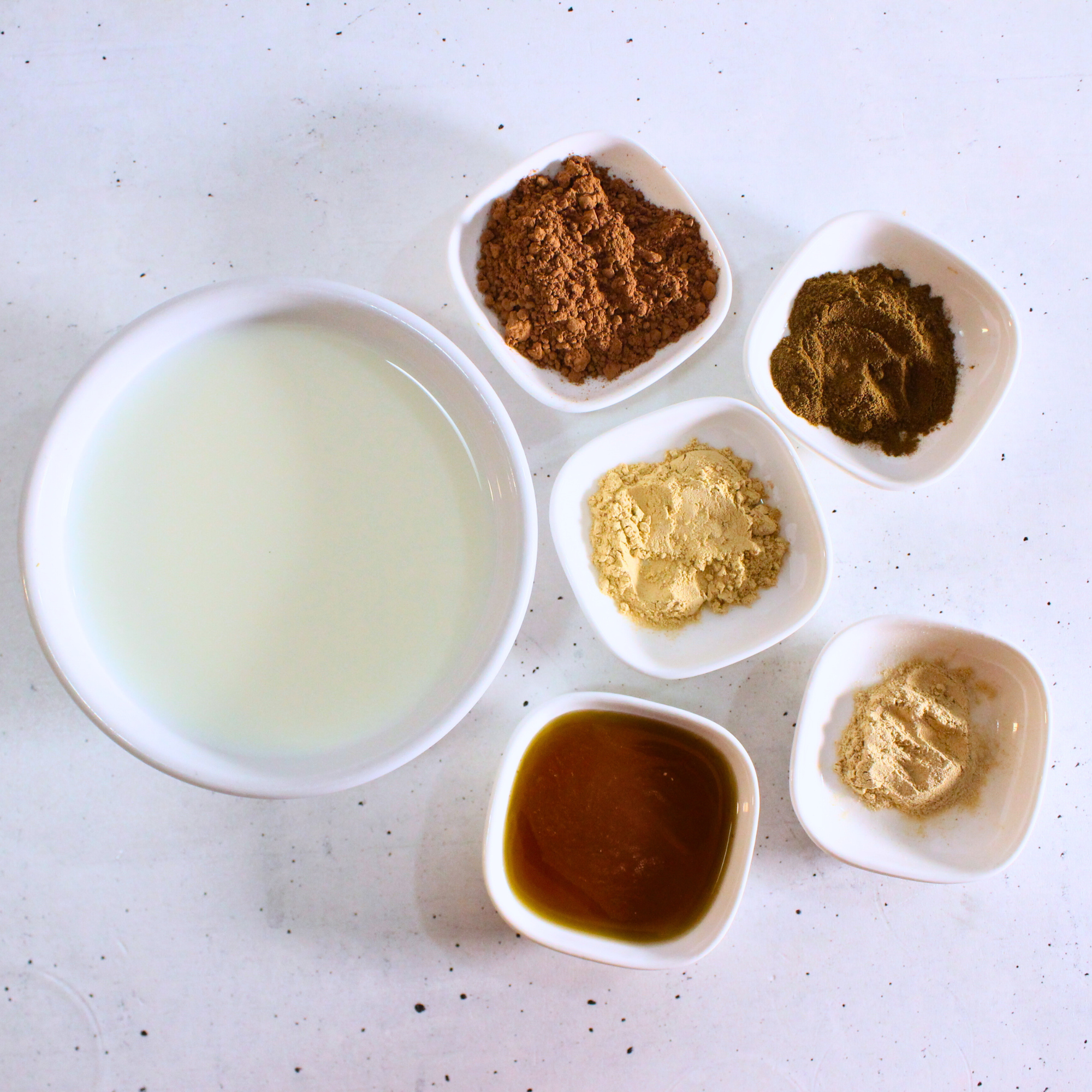 For this recipe you will need cacao powder, ashwagandha powder, reishi mushroom powder, maca root powder, maple syrup, and milk of choice.