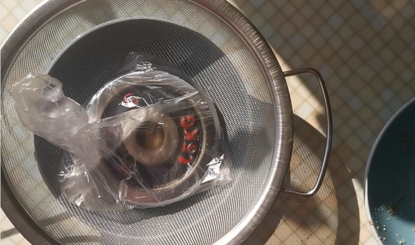 Step 3: Now comes the exciting part – extracting the oil. There are different methods to do this, but the one that worked for me was to place the pattie/cake of ground seeds into a strainer over a bowl, and set a weight over the top. The weight I used was 1.5 kg.