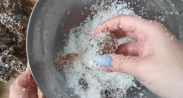 Step 7: Roll into 1-inch balls with enough coconut to make sure they are no longer sticky.