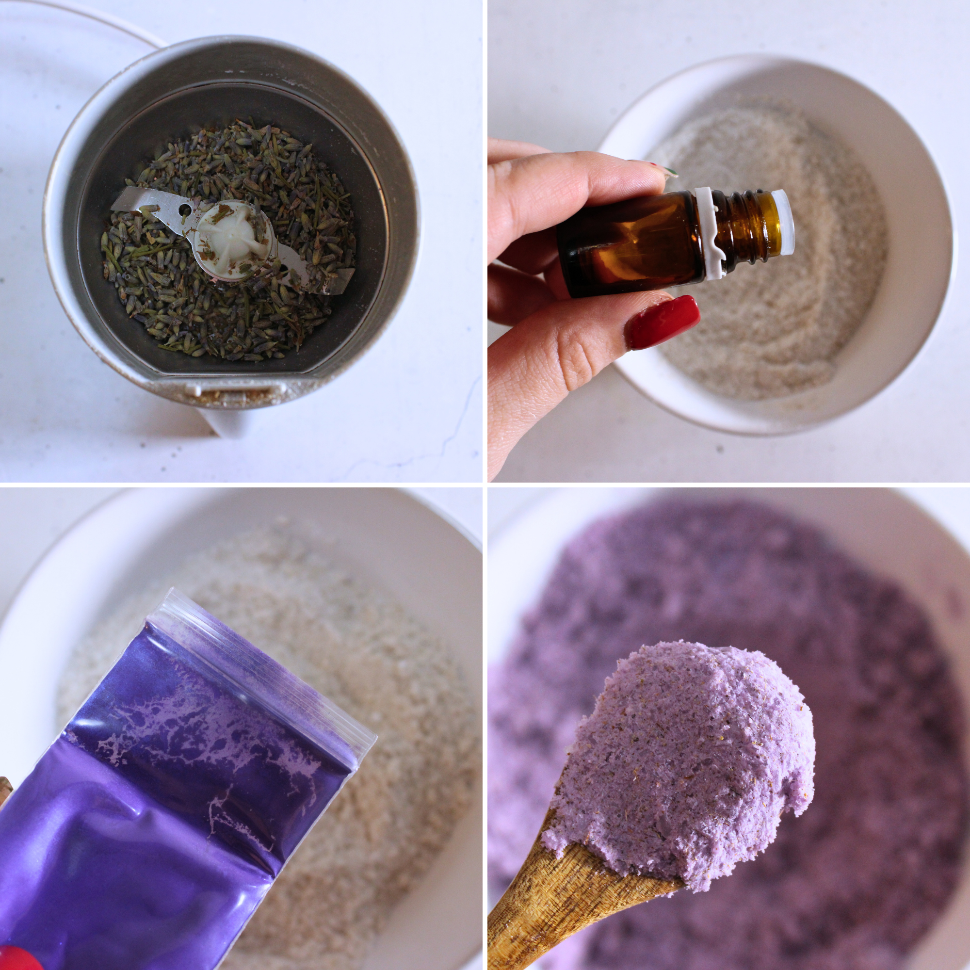 - Add the lavender powder to the dry mixture and stir well. Then add the lavender essential oil and mix thoroughly so the scent is evenly distributed.