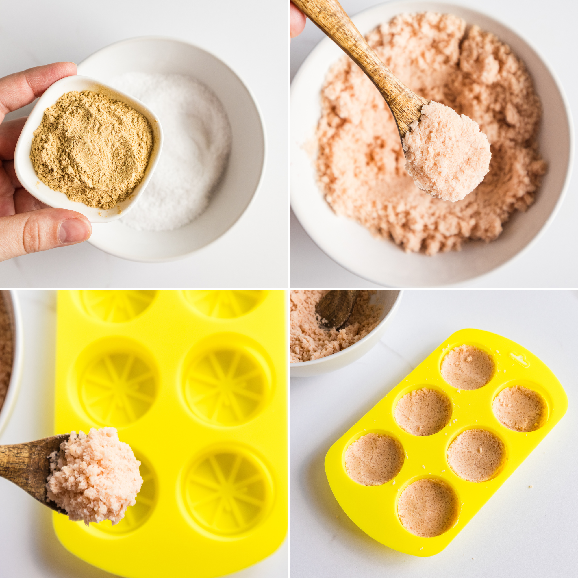 Stir in the orange peel powder. If using, add a small amount of orange mica powder and mix until the color is evenly distributed. Slowly drizzle in the water while stirring continuously. The mixture should feel like damp sand and hold together when pressed.