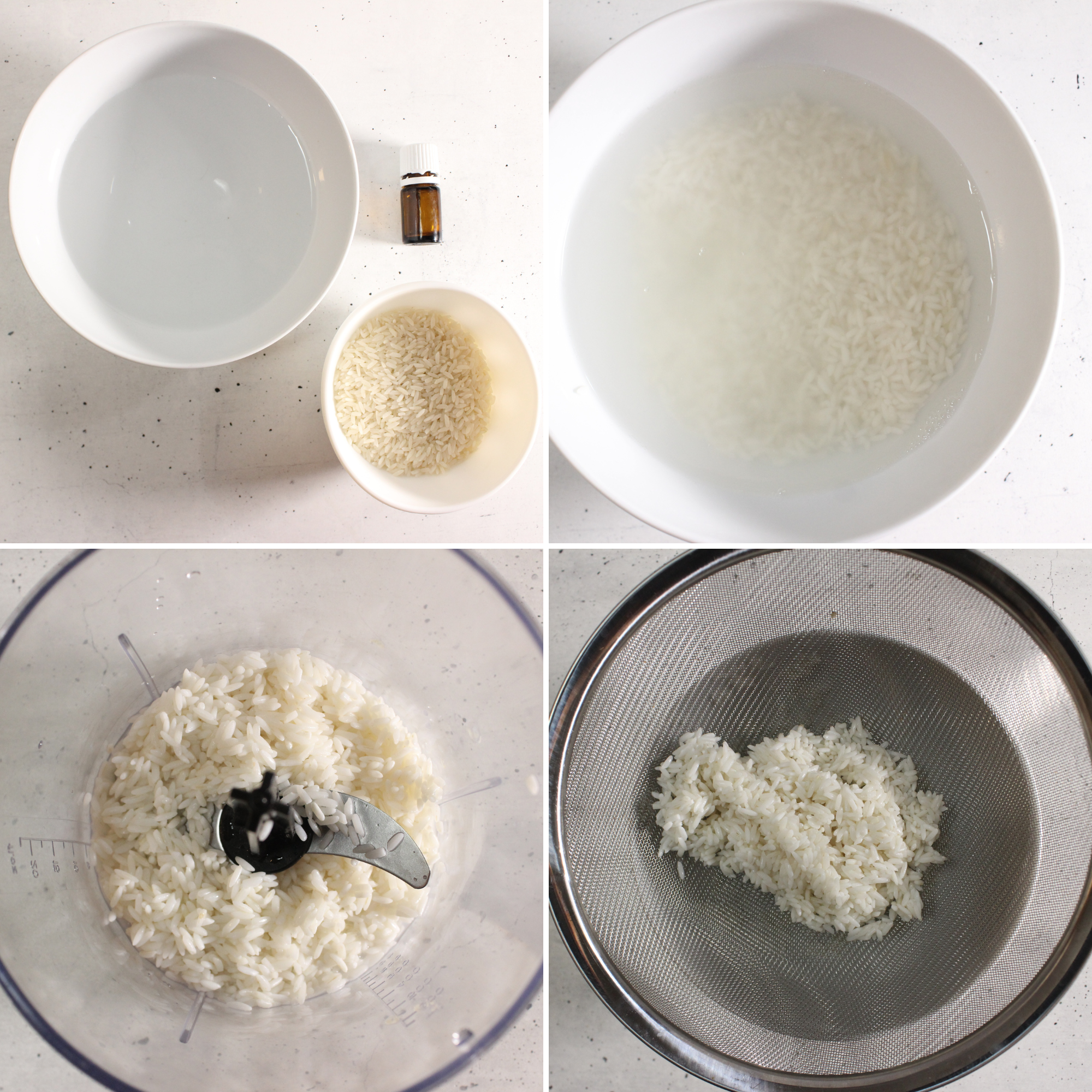 For this DIY, you will need white rice, water, and essential oils.